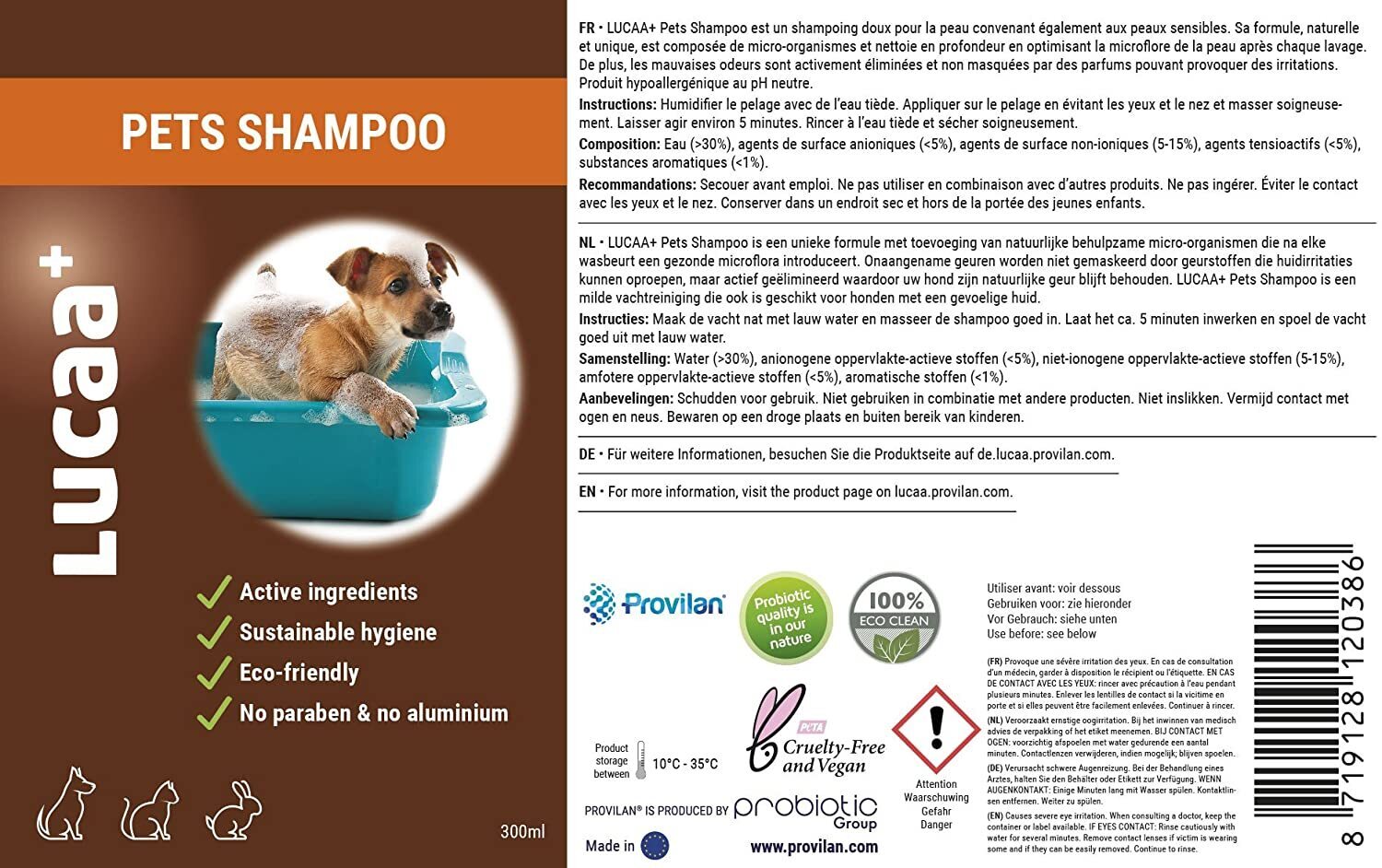 LUCAA+ Pet Shampoo is a unique formula with added natural helpful microorganisms that introduces a healthy microflora after each wash. Organic molecules responsible for unpleasant odours are not masked by fragrances that can evoke skin irritations, but actively eliminated so your dog keeps its natural fragrance. The environmentally friendly ingredients are safe to use for any type of fur.
