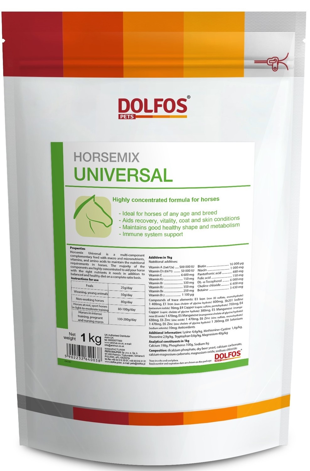 Horsemix Universal Horsemix Universal is a multi-component complementary feed with macro and micronutrients, vitamins, and amino acids to maintain the nutritional requirements in horses. The majority of the components are highly concentrated to aid your horse with the right nutrients it needs in addition to balanced and healthy diet on a complete ratio basis.