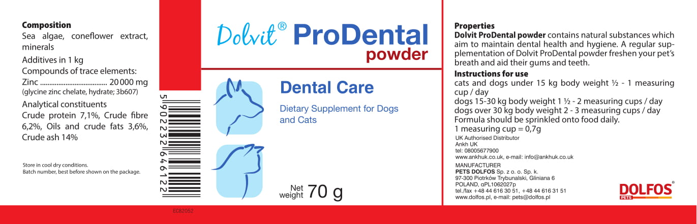 Dolvit ProDental powder contains natural substances which aim to maintain dental health and hygiene. A regular supplementation of Dolvit ProDental powder freshen your pet’s breath and aid their gums and teeth.