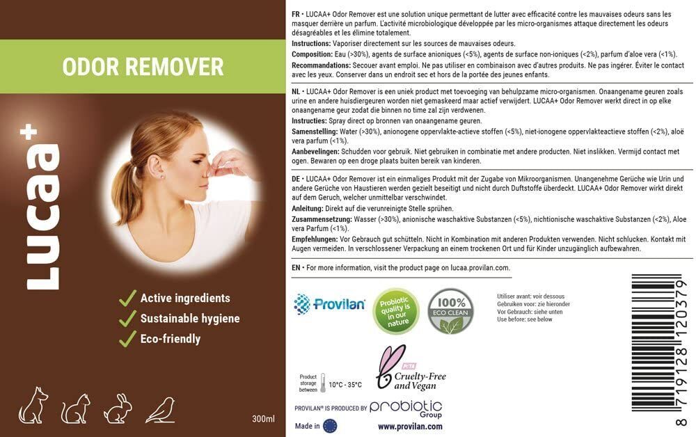 LUCAA+ Odor Remover is a unique product with the addition of microorganisms. Without adding dyes so it does not leave stains. Organic molecules responsible for unpleasant odours such as urine and other pet odours are actively removes and not masked by fragrances. LUCAA+ Odor Remover works directly on the scent that will be gone in no time.
